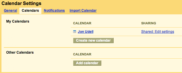 This tab is for sharing within the Google realm, but that’s not the scenario I’m going for. It shouldn’t be necessary to sign into Google to see a family calendar hosted there, it should be possible to subscribe directly from Outlook 2007. And you can, but this is the wrong place to do it. You have to switch over to the first tab: