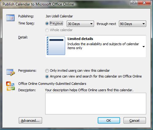 This seems analogous to the Google Calendar situation, but only partly. The invited users option is indeed analogous to the Google counterpart. Here those invited users will need to have Windows Live IDs in order to use the sharing URL that’s produced. But the other choice doesn’t produce a private URL, it produces one that’s discoverable in Office Online. (Or, I guess, will be when calendar search is implemented there.) So while the sharing URL that’s produced in both these cases looks like a private URL — that is, it includes the kind of random character string that often functions as a password embedded in the URL — in this case you’d be wrong to use it as though it were a private URL.