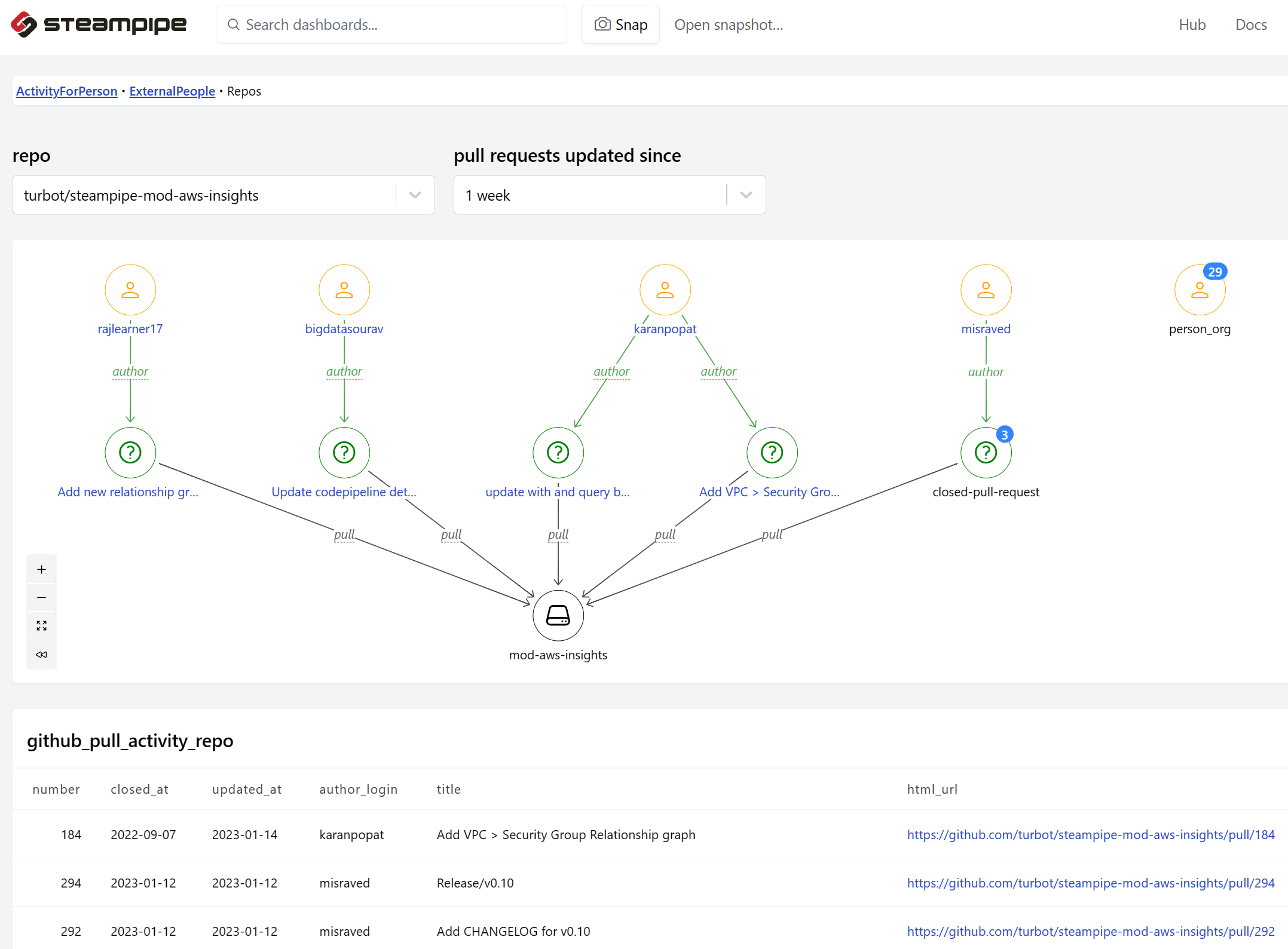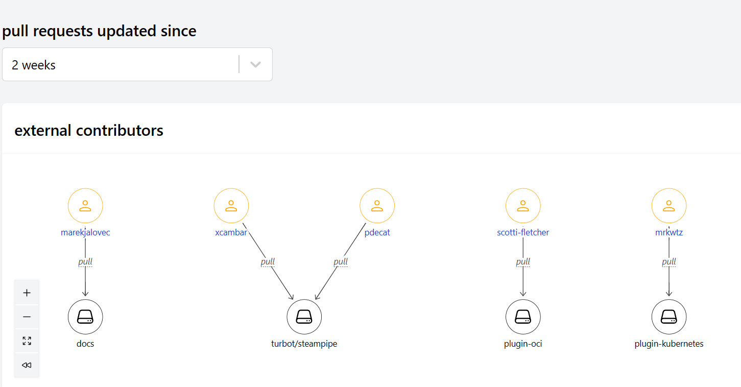 These relationship graphs are driven by SQL queries that define nodes and edges. Such queries can use any column of any table provided by any Steampipe plugin to form nodes, and then edges between nodes. If you want to see connections among the people and objects represented by diverse APIs, you can now use SQL idioms to graph them. The only limit is your imagination.