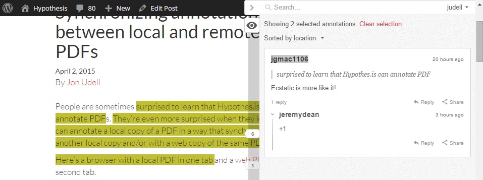 The URL, which we call a direct link, isn’t itself a standard way to address a selection of text, it’s just a link that points to a web resource. But the resource it points to, which describes the highlighted text and its coordinates within the document, is — since February of this year — a W3C standard. The way I like to think about it is that the highlighted phrase — and every possible highlighted phrase — has its own home page on the web, a place where humans and machines can jointly focus attention.